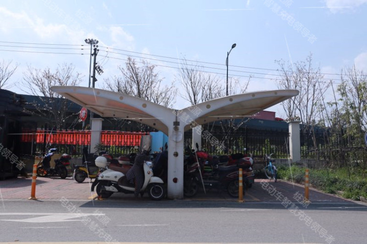 范的樁源電動(dòng)車智慧充電站, 戶外架起了可抗12級(jí)臺(tái)風(fēng)的鋼膜結(jié)構(gòu)雨棚,室內(nèi)也規(guī)劃了專門的停車位,